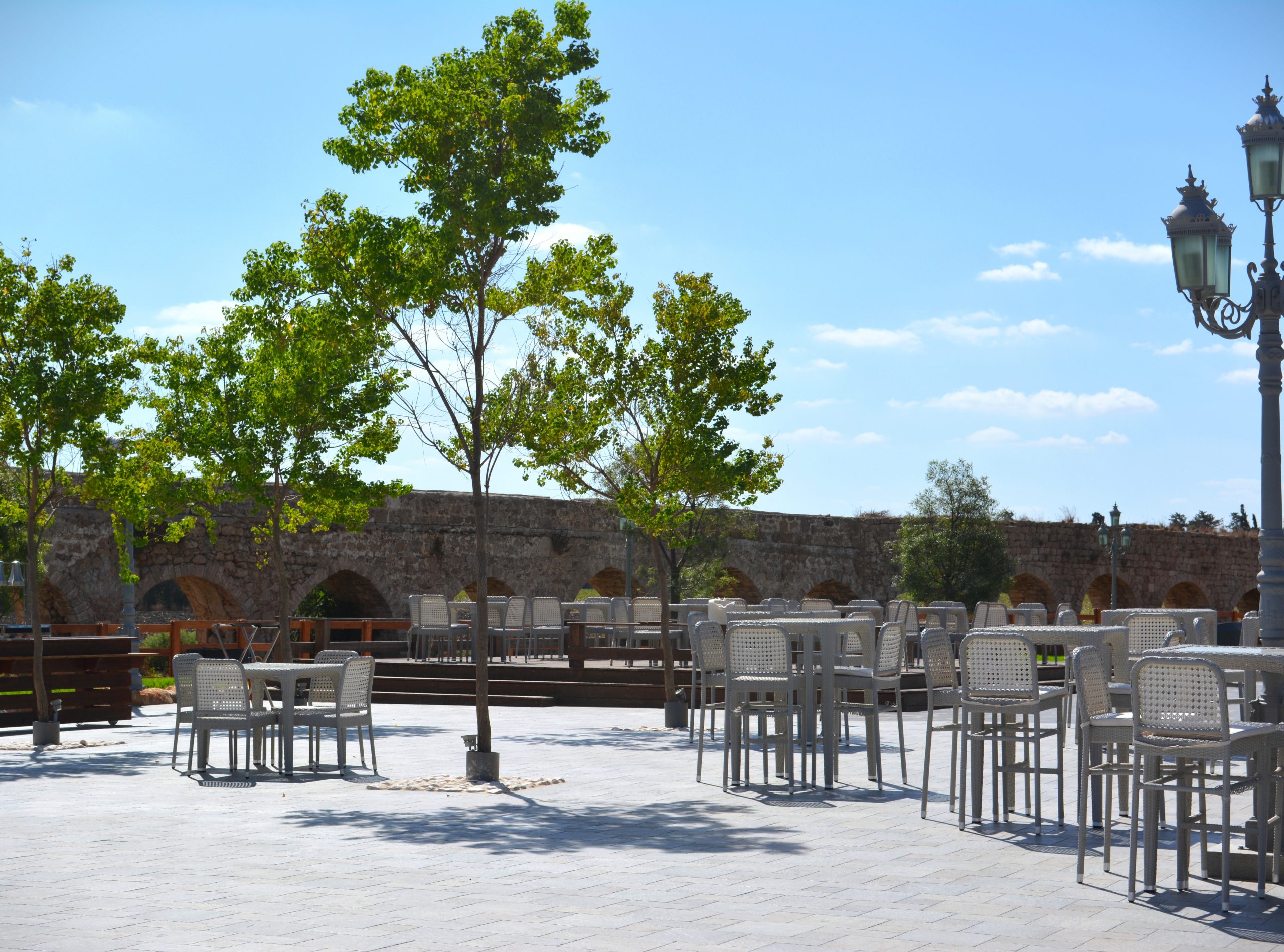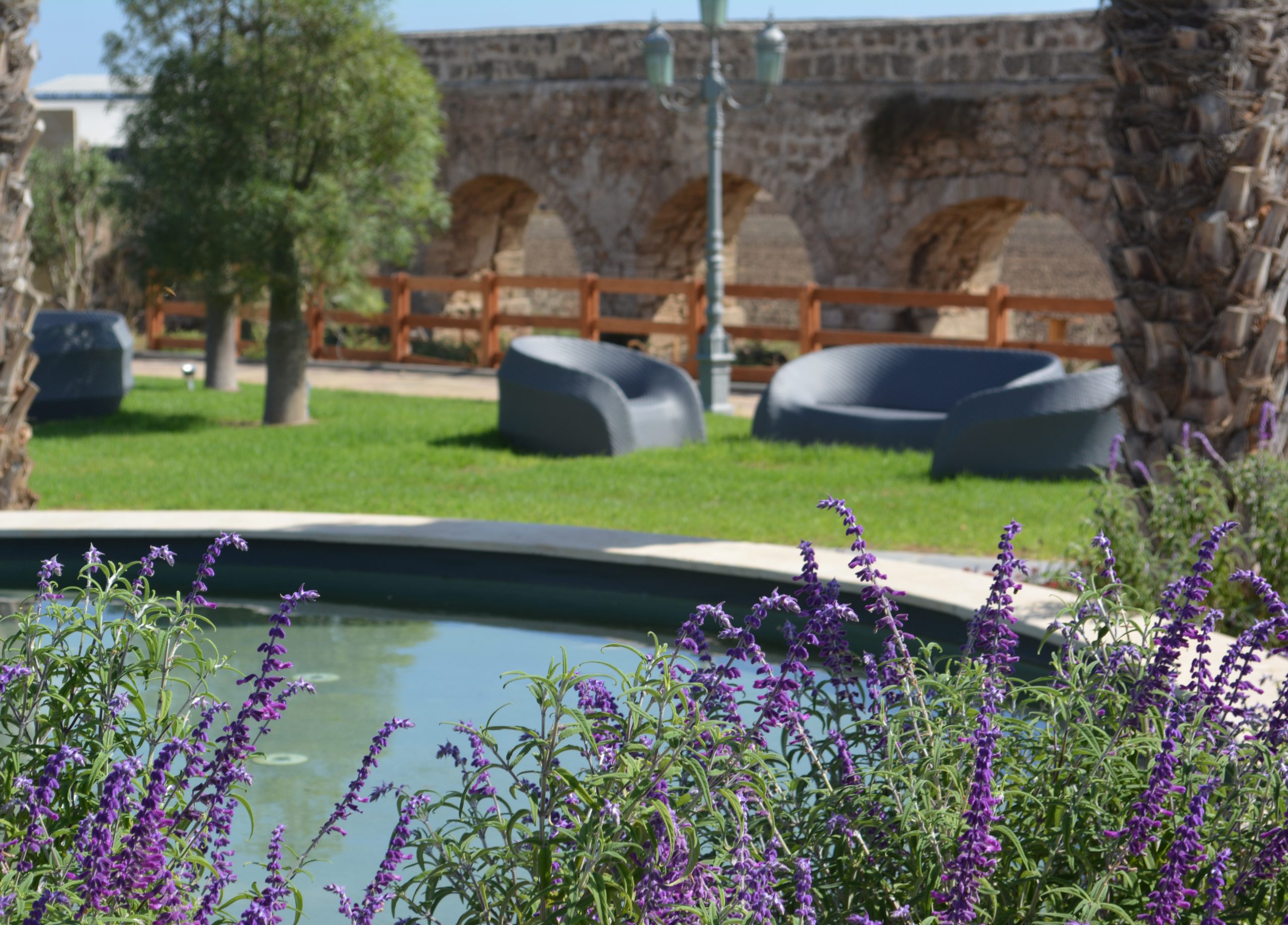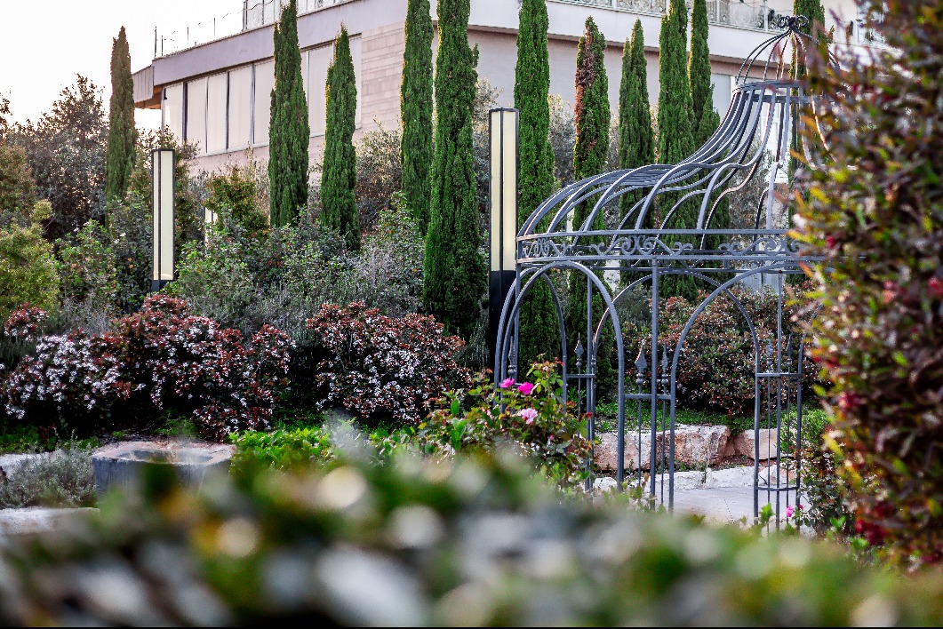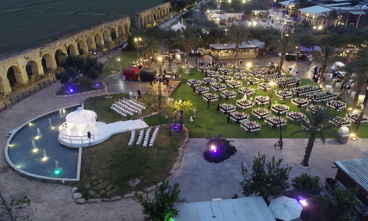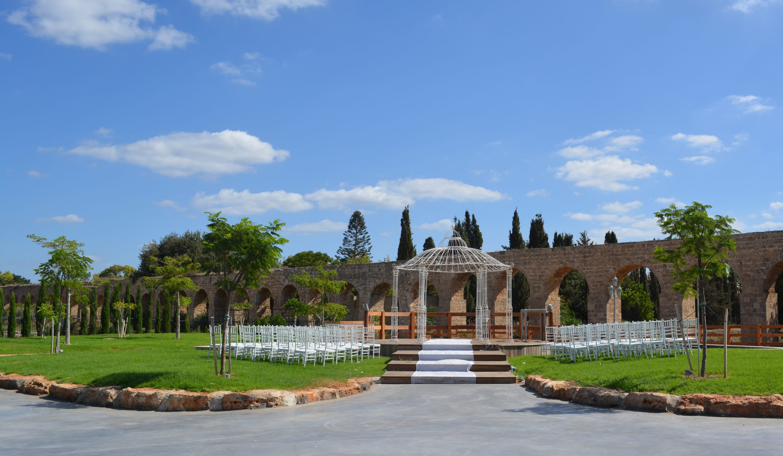 גן אירועים רחב ידיים , המשתרע לאורך אמת מים רומית עתיקה, תוכנן כמרחב נוף ייחודי וקסום. הגן עטוף בצמחייה רב־שנתית, ערוגות פרחים עונתיים וטרסות דשא מדורגות. השילוב של ההיסטוריה המרשימה הנמצאת במקום, יחד עם תכנון נוף עכשווי, יוצר אווירה יוקרתית, שלווה ומוקפדת.