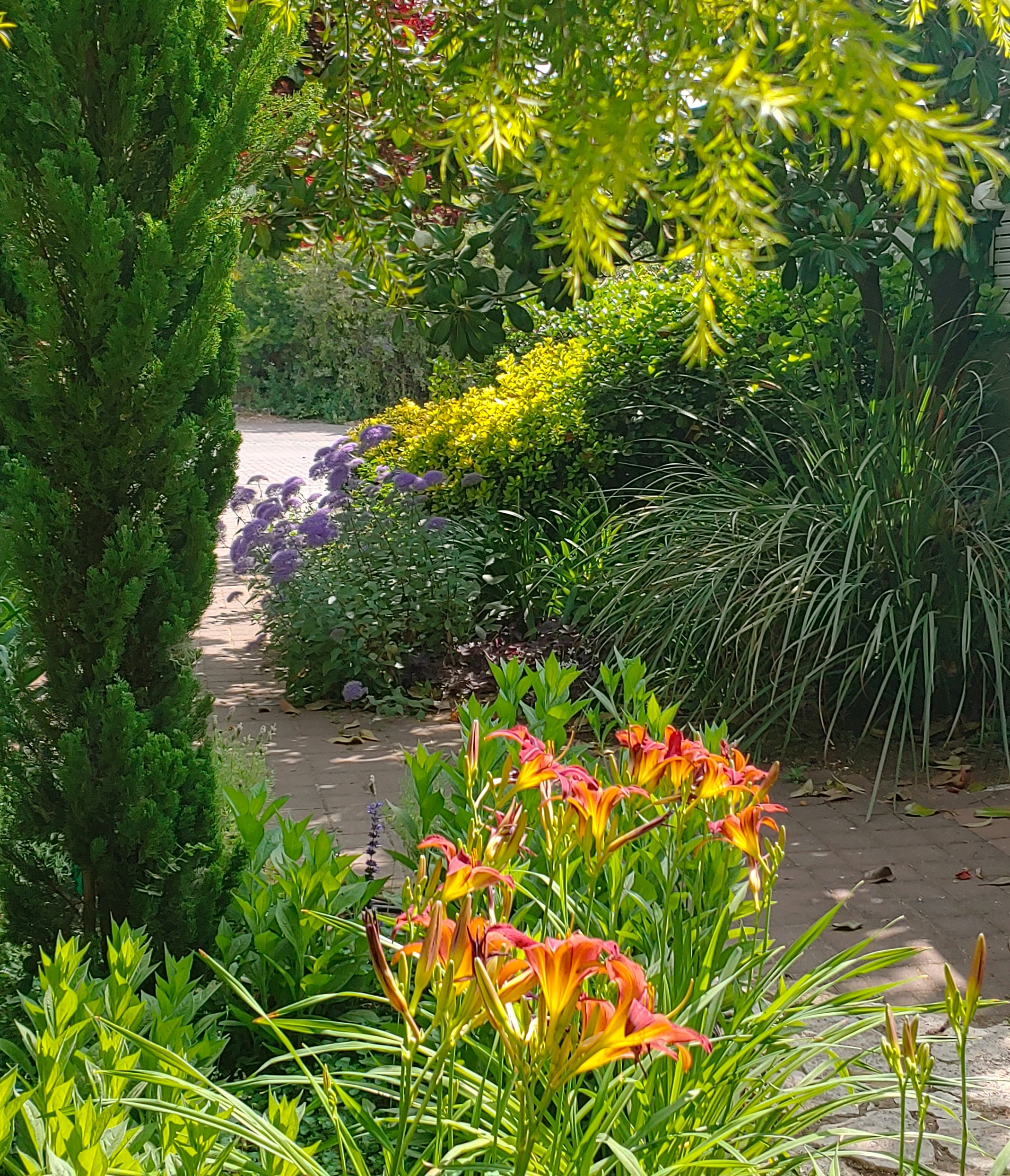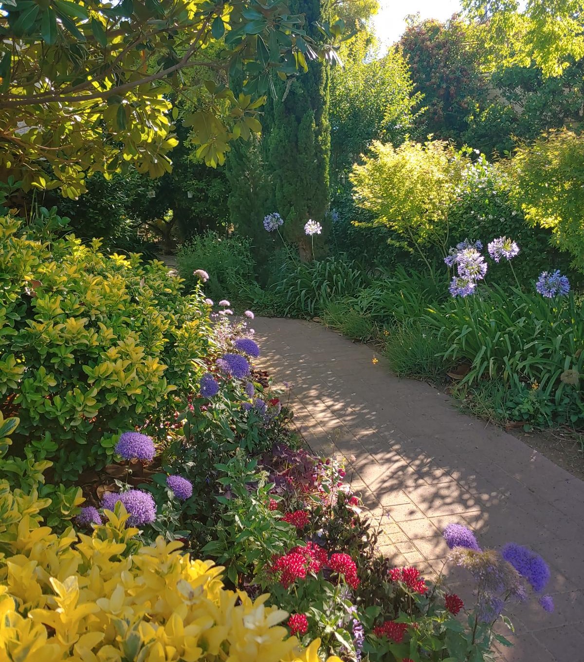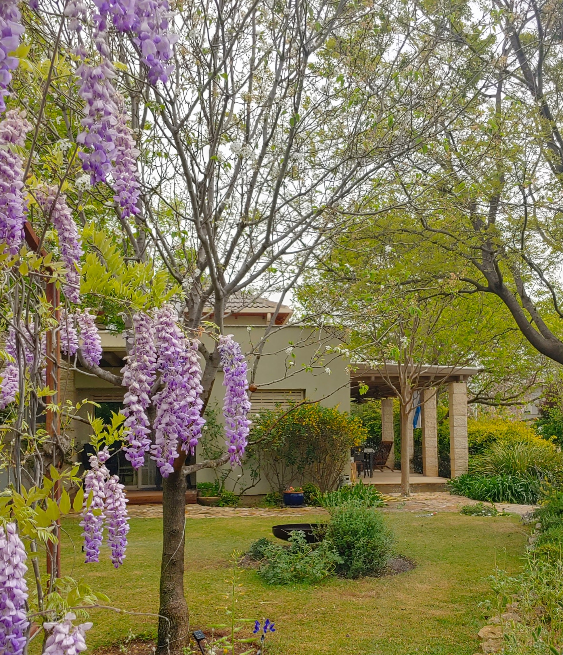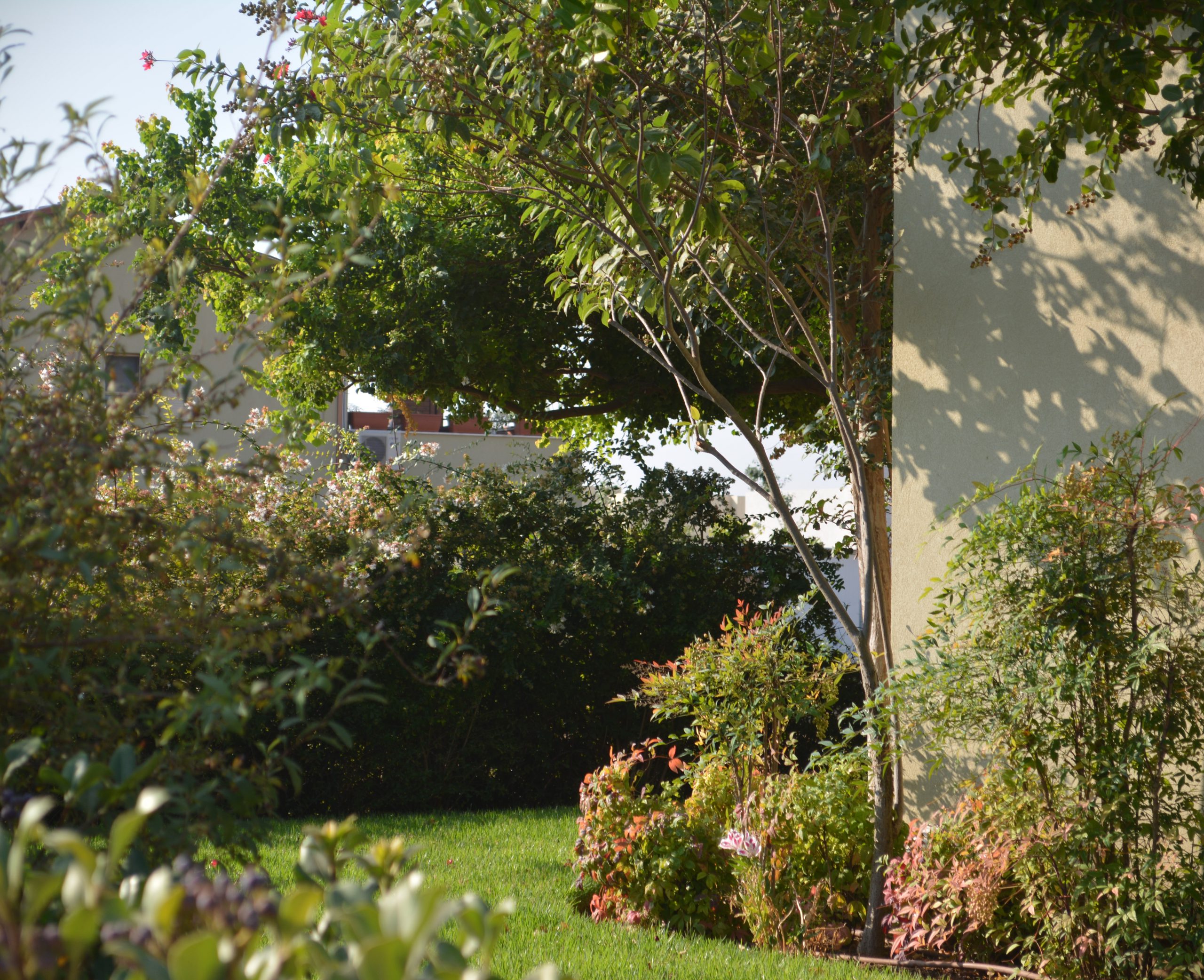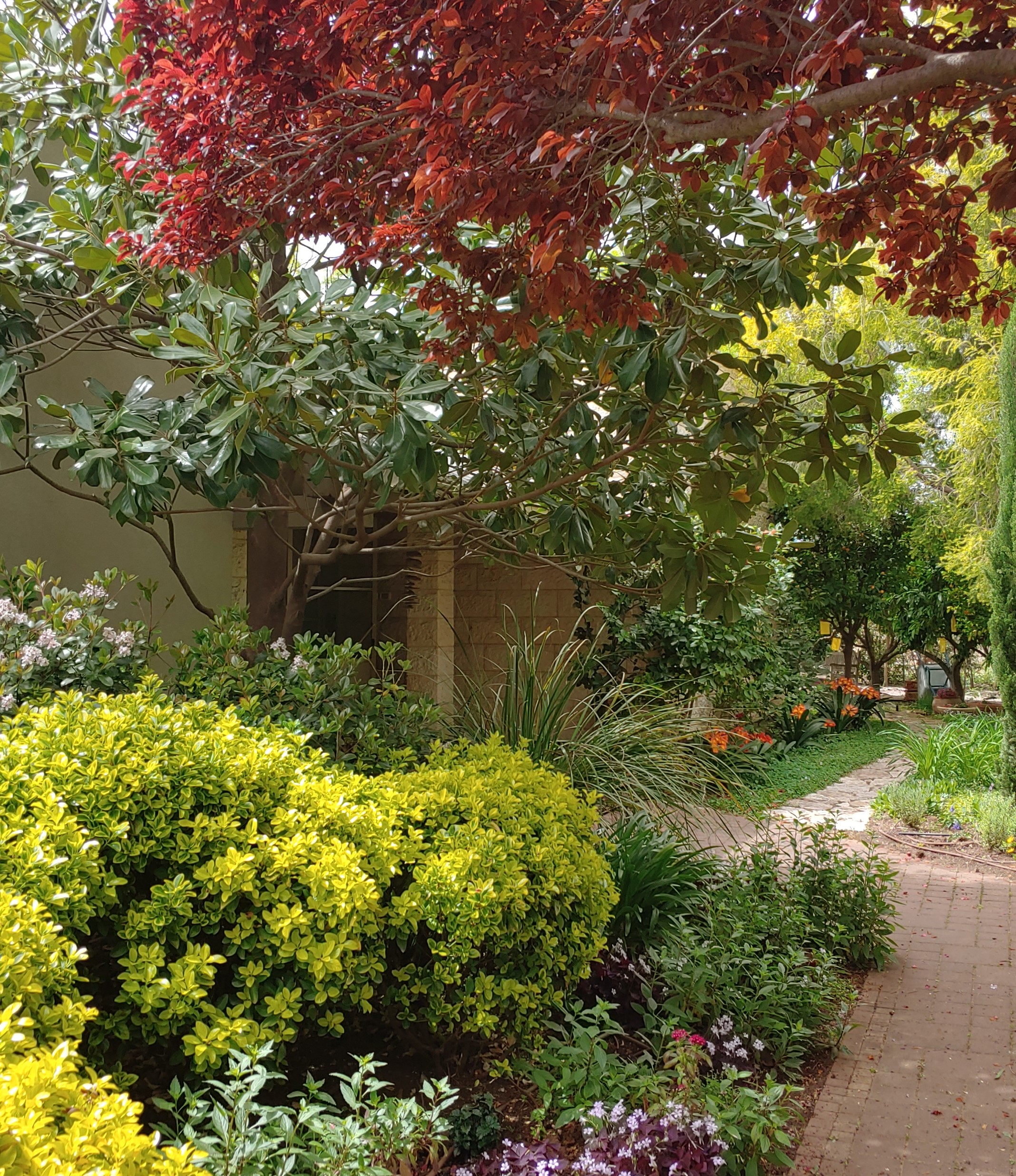 בגן עצים גבוהים המעניקים צל נעים, ומגוון פרחים המלבלבים לאורך עונות השנה.