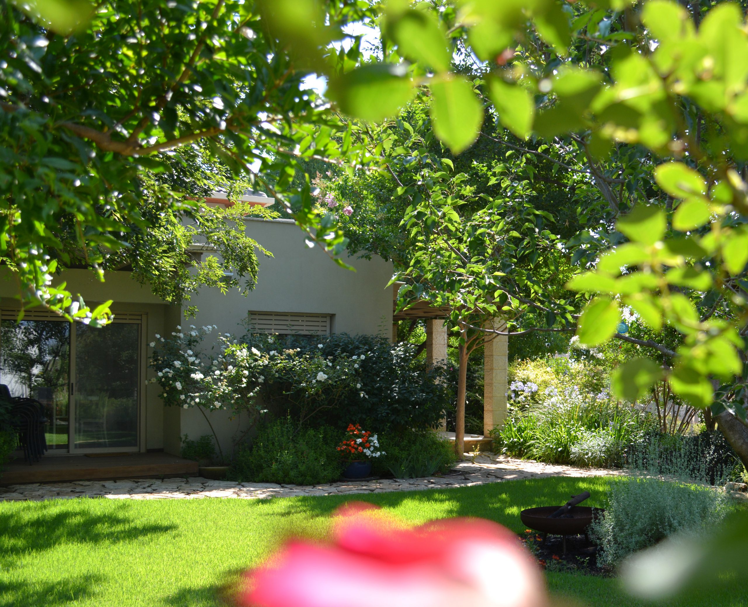 מגוון עצי פרי ופינות ישיבה שונות, כל אחת עם אופי ייחודי.