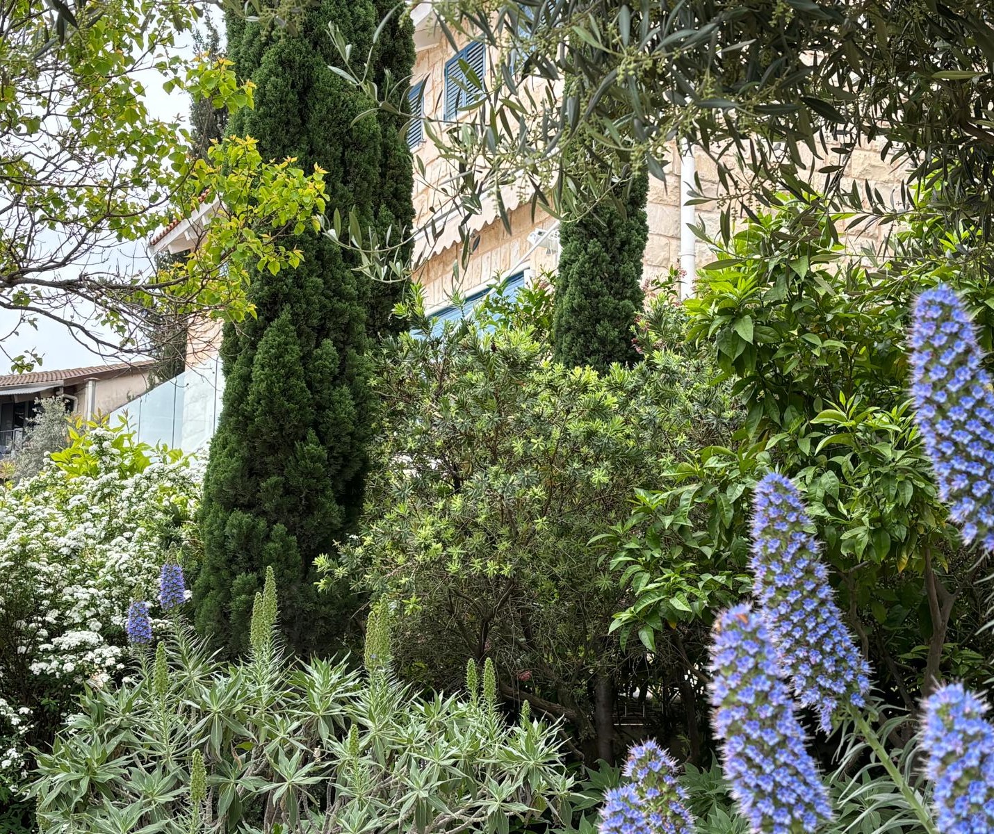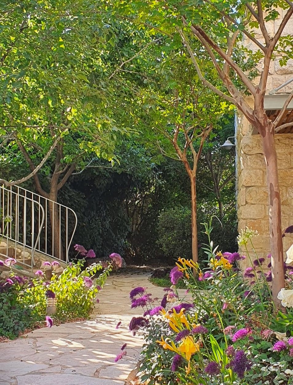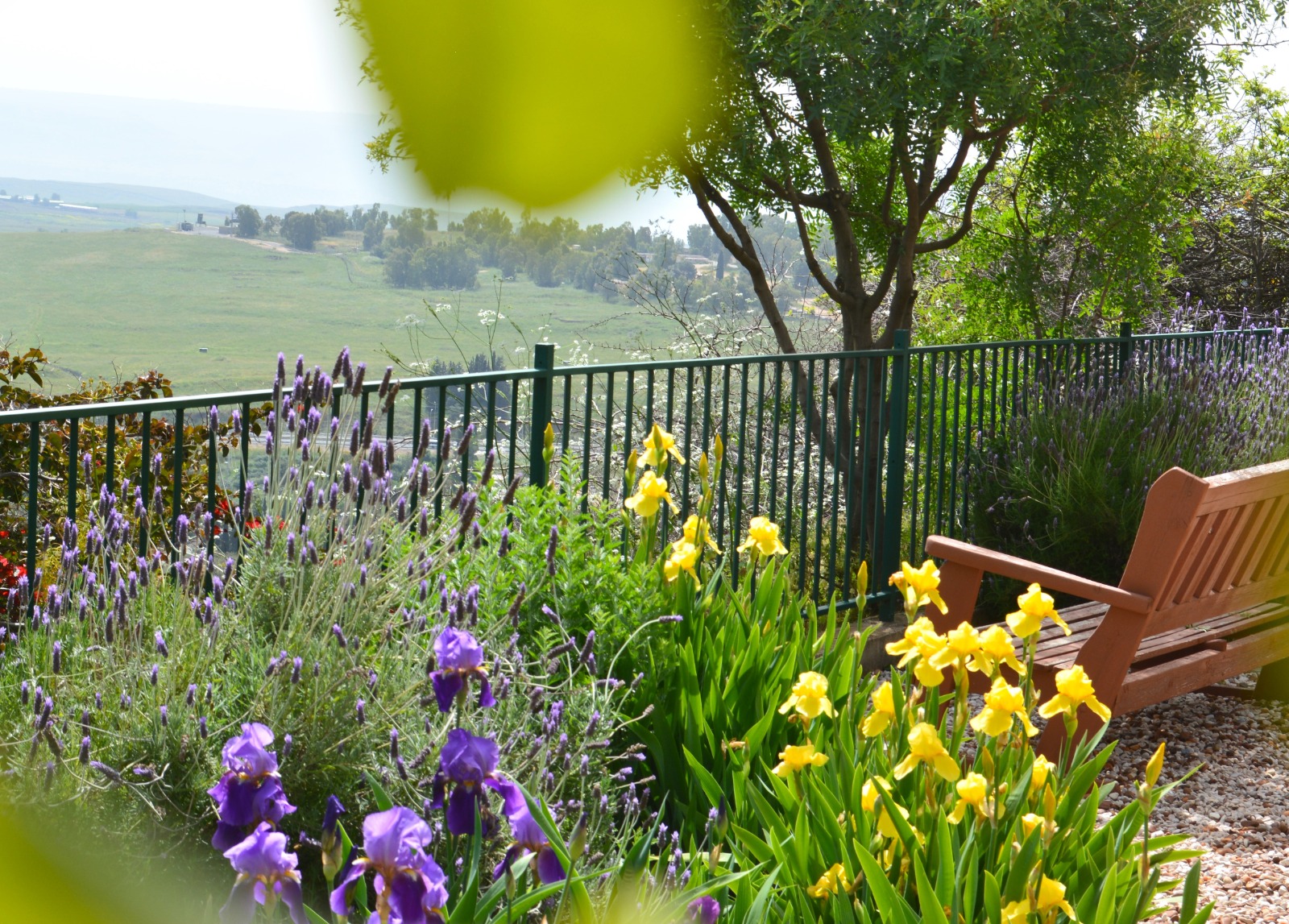 גן בסגנון ים תיכוני, התוכנן בדגש על פשטות ונוחות. הגן מתפרש על שני מפלסים, בחלקו התחתון נמצאים מדשאה, פינות ישיבה נעימות הצופות לעמק החולה ולרמת הגולן, וישנם עצי פרי רבים, גן ירק וצמחייה הצובעת את הגן בצבעים שונים.